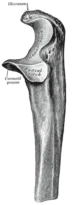 Near the elbow, the ulna has two curved processes, the olecranon and the coronoid process; and two concave, articular cavities, the semilunar and radial notches.[4]