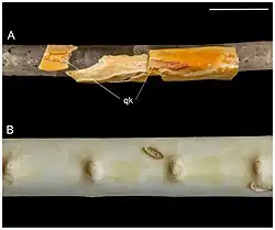 In birds and other dinosaurs, the ulna forms a surface of attachment for the secondary feathers. These often leave osteological evidence in the form of quill knobs, allowing for identification of feathers in fossils that otherwise lack integumentary information.[8]