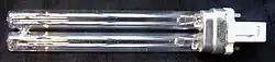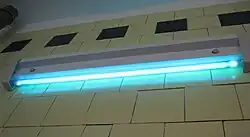 Shortwave UV lamps are made using a fluorescent lamp tube with no phosphor coating, composed of fused quartz or vycor, since ordinary glass absorbs UVC. These lamps emit ultraviolet light with two peaks in the UVC band at 253.7 nm and 185 nm due to the mercury within the lamp, as well as some visible light. From 85% to 90% of the UV produced by these lamps is at 253.7 nm, whereas only 5–10% is at 185 nm.[44] The fused quartz tube passes the 253.7 nm radiation but blocks the 185 nm wavelength. Such tubes have two or three times the UVC power of a regular fluorescent lamp tube. These low-pressure lamps have a typical efficiency of approximately 30–40%, meaning that for every 100 watts of electricity consumed by the lamp, they will produce approximately 30–40 watts of total UV output. They also emit bluish-white visible light, due to mercury's other spectral lines. These "germicidal" lamps are used extensively for disinfection of surfaces in laboratories and food-processing industries.[45]