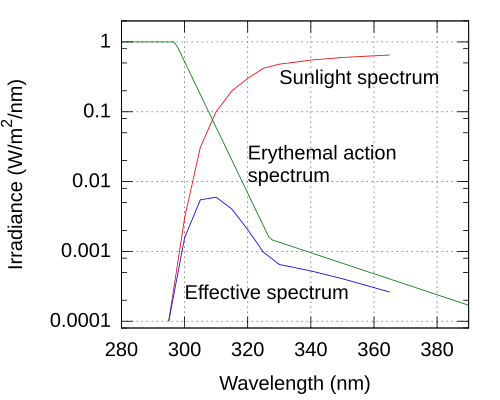 The electromagnetic spectrum of ultraviolet radiation (UVR), defined most broadly as 10–400 nanometers, can be subdivided into a number of ranges recommended by the ISO standard ISO 21348:[22]