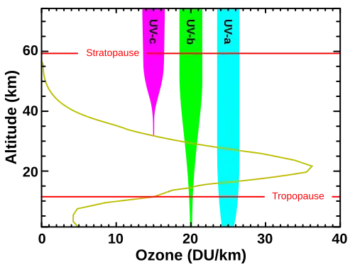 Levels of ozone at various altitudes (DU/km) and blocking of different bands of ultraviolet radiation: In essence, all UVC is blocked by diatomic oxygen (100–200 nm) or by ozone (triatomic oxygen) (200–280 nm) in the atmosphere. The ozone layer then blocks most UVB. Meanwhile, UVA is hardly affected by ozone, and most of it reaches the ground. UVA makes up almost all UV light that penetrates the Earth's atmosphere.