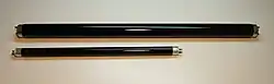 Two black light fluorescent tubes, showing use. The longer tube is a F15T8/BLB 18 inch, 15 watt tube, shown in the bottom image in a standard plug-in fluorescent fixture. The shorter is an F8T5/BLB 12 inch, 8 watt tube, used in a portable battery-powered black light sold as a pet urine detector.