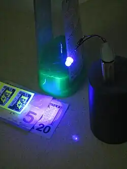 The cheaper and more common 395 nm UV LEDs are much closer to the visible spectrum, and give off a purple color. Other UV LEDs deeper into the spectrum do not emit as much visible light.[48] LEDs are used for applications such as UV curing applications, charging glow-in-the-dark objects such as paintings or toys, and lights for detecting counterfeit money and bodily fluids. UV LEDs are also used in digital print applications and inert UV curing environments. As technological advances beginning in the early 2000s have improved their output and efficiency, they have become increasingly viable alternatives to more traditional UV lamps for use in UV curing applications, and the development of new UV LED curing systems for higher-intensity applications is a major subject of research in the field of UV curing technology.[49]