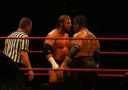 In June, Umaga was re-entered into a feud with Marella. When they met at the Vengeance pay-per-view on June 24, Umaga was solidly in control of the match, but lost by disqualification when he disregarded the referee's instructions and continued to punch Marella.[26] In a rematch on the July 2 episode of Raw, Umaga defeated Marella to win the Intercontinental Championship for the second time.[27] On the August 6 episode of Raw, Umaga turned face by joining forces with John Cena to face Carlito and Randy Orton in a tag team match on August 13,[28] which they won.[29] He defeated both Carlito and Mr. Kennedy in a triple threat match at SummerSlam on August 26 to retain the Intercontinental Championship.[30] He then interrupted a match between Kennedy and the returning Jeff Hardy the following night on Raw, assaulting Hardy and leaving him lying in the ring,[31] thus turning heel once again. One week later, on the September 3 episode of Raw, Umaga lost the Intercontinental Championship to Hardy.[2]