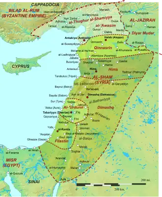Abu Bakr's successor Umar (r. 634–644) curtailed the influence of the Qurayshite elite in favor of Muhammad's earlier supporters in the administration and military, but nonetheless allowed the growing foothold of Abu Sufyan's sons in Syria, which was all but conquered by 638.[27] When Umar's overall commander of the province Abu Ubayda ibn al-Jarrah died in 639, he appointed Yazid governor of Syria's Damascus, Palestine and Jordan districts.[27] Yazid died shortly after and Umar appointed his brother Mu'awiya in his place.[28] Umar's exceptional treatment of Abu Sufyan's sons may have stemmed from his respect for the family, their burgeoning alliance with the powerful Banu Kalb tribe as a counterbalance to the influential Himyarite settlers in Homs who viewed themselves as equals to the Quraysh in nobility, or the lack of a suitable candidate at the time, particularly amid the plague of Amwas which had already killed Abu Ubayda and Yazid.[28] Under Mu'awiya's stewardship, Syria remained domestically peaceful, organized and well-defended from its former Byzantine rulers.[29]