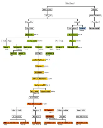 Genealogical tree of the Sufyanids. The names in red indicate caliphs.