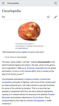 Uncyclopedia is the name of several forks of satirical online encyclopedias that parody Wikipedia. Its logo, a hollow "puzzle potato", parodies Wikipedia's globe puzzle logo,[2] and it styles itself as "the content-free encyclopedia", parodying Wikipedia's slogan of "the free encyclopedia" and likely as a play on the fact that Wikipedia is described as a "free-content" encyclopedia. Founded in 2005[3] as an English-language wiki, the project spans more than 75 languages as well as several subprojects parodying other wikis. Uncyclopedia's name is a portmanteau of the prefix un- and the word encyclopedia.[4][5]