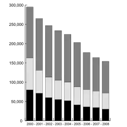 Notes: Europe figures for 2000–2003 are all Europe; from 2004 figures in black are Western Europe. For 2004–2008 figures for Asia and Africa include Eastern and Central Europe.