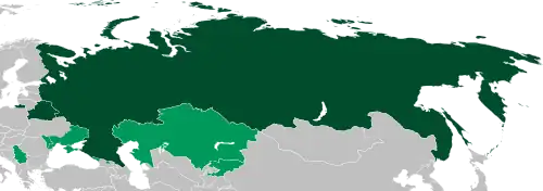 The Union State is based on a previous international treaty between Russia and Belarus[8] made on 2 April 1997.[9] Although it consists of only Russia and Belarus, other countries are allowed to join.[6] The supranational union is ruled through the Supreme State Council[10] and other governing bodies.[11] As of 2025, the current president of the Supreme State Council of the Union is Alexander Lukashenko, who has held the position since 2000.[12] The present goal of the Union State mainly focuses on economic integration,[13] taxation,[14] and integration of defence and intelligence apparatus.[15]