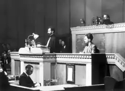 With the spread of decolonization in the 1960s, the UN's membership shot up due to an influx of newly independent nations. In 1960 alone, 17 new states joined the UN, 16 of them from Africa.[46] On 25 October 1971, with opposition from the United States, but with the support of many Third World nations, the People's Republic of China was given the Chinese seat on the Security Council in place of the Republic of China (also known as Taiwan). The vote was widely seen as a sign of waning American influence in the organization.[54] Third World nations organized themselves into the Group of 77 under the leadership of Algeria, which briefly became a dominant power at the UN.[55] On 10 November 1975, a bloc comprising the Soviet Union and Third World nations passed a resolution, over strenuous American and Israeli opposition, declaring Zionism to be a form of racism. The resolution was repealed on 16 December 1991, shortly after the end of the Cold War.[56][57]