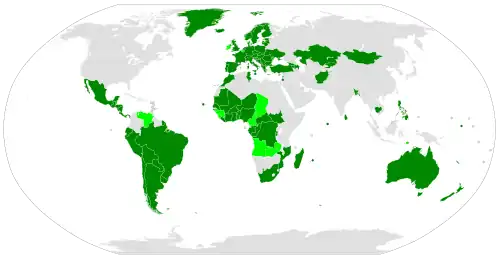 The text of the convention was adopted by the United Nations General Assembly on 10 December 1984[1] and, following ratification by the 20th state party,[3] it came into force on 26 June 1987.[1] 26 June is now recognized as the International Day in Support of Victims of Torture, in honor of the convention. Since the convention's entry was enforced, the absolute prohibition against torture and other acts of cruel, inhuman, or degrading treatment or punishment has become accepted as a principle of customary international law.[6] As of April 2024, the convention has 174 state parties.[1]