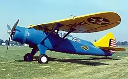 The Air Corps adopted a new color scheme for painting its aircraft in 1927, heretofore painted olive drab. The wings and tails of aircraft were painted chrome yellow, with the words "U.S. ARMY" displayed in large black lettering on the undersurface of the lower wings. Tail rudders were painted with a vertical dark blue band at the rudder hinge and 13 alternating red-and-white horizontal stripes trailing. The painting of fuselages olive drab was changed to blue in the early 1930s, and this motif continued until late 1937, when all new aircraft (now all-metal) were left unpainted except for national markings.[19]