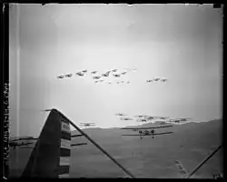 Formations of Keystone LB-7s (lower) and Boeing P-12s (upper) on aerial maneuvers over Burbank, California, 1930