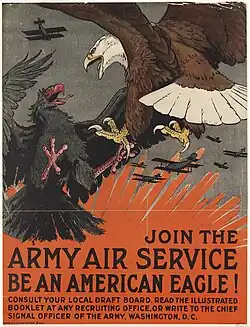 The United States Army Air Service (USAAS)[1] (also known as the "Air Service", "U.S. Air Service" and before its legislative establishment in 1920, the "Air Service, United States Army") was the aerial warfare service component of the United States Army between 1918 and 1926 and a forerunner of the United States Air Force. It was established as an independent but temporary branch of the U.S. War Department during World War I by two executive orders of President Woodrow Wilson: on May 24, 1918, replacing the Aviation Section, Signal Corps as the nation's air force; and March 19, 1919, establishing a military Director of Air Service to control all aviation activities.[2] Its life was extended for another year in July 1919, during which time Congress passed the legislation necessary to make it a permanent establishment. The National Defense Act of 1920 assigned the Air Service the status of "combatant arm of the line" of the United States Army with a major general in command.[3]