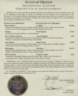 Article II, Section 1, Clause 2 of the United States Constitution directs each state to appoint a number of electors equal to that state's congressional delegation (the number of members of the House of Representatives plus two senators). The same clause empowers each state legislature to determine the manner by which that state's electors are chosen but prohibits federal office holders from being named electors. Following the national presidential election day on Tuesday after the first Monday in November,[15] each state, and the federal district, selects its electors according to its laws. After a popular election, the states identify and record their appointed electors in a Certificate of Ascertainment, and those appointed electors then meet in their respective jurisdictions and produce a Certificate of Vote for their candidate; both certificates are then sent to Congress to be opened and counted.[16]
