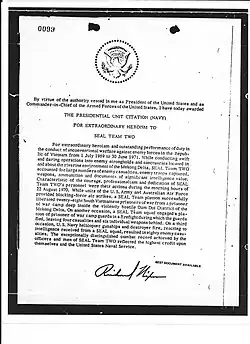 By 1970, President Richard Nixon initiated a plan of Vietnamization, which would remove the US from the Vietnam War and return the responsibility of defense back to the South Vietnamese. Conventional forces were being withdrawn; the last SEAL platoon left South Vietnam on 7 December 1971, and the last SEAL advisor left South Vietnam in March 1973. The SEALs were among the most highly decorated units for their size in the war, receiving by 1974 one Medal of Honor, two Navy Crosses, 42 Silver stars, 402 Bronze Stars, two Legions of Merit, 352 Commendation Medals, and 51 Navy Achievement Medals[43] Later awards would bring the total to three Medals of Honor and five Navy Crosses. SEAL Team One was awarded three Presidential Unit Citations and one Navy Unit Commendation; SEAL Team Two received two Presidential Unit Citations.[44] By the end of the war, 48 SEALs had been killed in Vietnam, but estimates of their kill count are as high as 2,000. The Navy SEAL Museum in Fort Pierce, Florida, displays a list of the 48 SEALs who lost their lives in combat during the Vietnam War.[45]