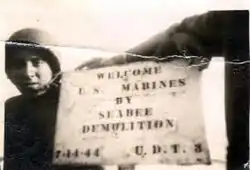 Because they were so integral to the success of missions in the Pacific during the war, the U.S. Navy did not publicize the existence of the UDTs until post-war.[32] During WWII the Navy did not have a rating for the UDTs nor did they have an insignia. Those men with the CB rating on their uniforms considered themselves Seabees that were doing underwater demolition (Fig. 11). They did not call themselves "UDTs" or "Frogmen" but rather "Demolitioneers" which had carried over from the NCDUs[33] and Lt Cdr Kauffman's recruiting efforts from the Seabee dynamiting and demolition school. The next largest group of UDT volunteers came from the joint Army-Navy Scouts and Raiders school that was also in Fort Pierce and the Navy's bomb disposal school in the Seabee-dominated teams.