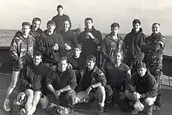 Seabees made up the vast majority of the men in teams 1–9, 13, and 15.[28][29] Seabees were roughly 20% of UDT 11.[28] The officers were mostly CEC.[30] At war's end 34 teams had been formed with teams 1–21 having actually been deployed. The Seabees provided over half of the men in the teams that saw service.