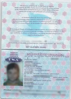 ![]() The polycarbonate data page of a contemporary next generation United States biometric passport | |