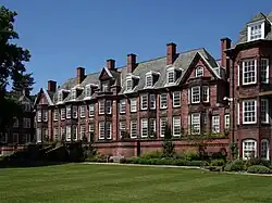 Final negotiations for part of what is now the Vale were completed in only March 1947. By then, properties that would have their names used for halls of residences, such as Wyddrington and Maple Bank, were under discussion and more land was obtained from the Calthorpe estate in 1948 and 1949, providing the setting for the Vale.[61] Landscape architect Mary Mitchell designed the layout of the campus and she included mature trees that were retained from the former gardens.[62] Construction on the Vale started in 1962 with the creation of a 3-acre (12,000 m2) artificial lake and the building of Ridge, High, Wyddrington and Lake Halls. The first, Ridge Hall, opened for 139 women in January 1964, with its counterpart High Hall admitting its first male residents the following October.[63]