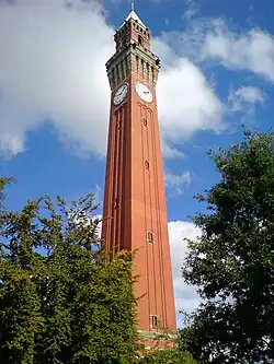 The campanile itself draws its inspiration from the Torre del Mangia, a medieval clock tower that forms part of the Town Hall in Siena, Italy.[54] When it was built, it was described as 'the intellectual beacon of the Midlands' by the Birmingham Post. The clock tower was Birmingham's tallest building from the date of its construction in 1908 until 1969; it is now the third highest in the city. It is one of the top 50 tallest buildings in the UK,[55] and the tallest free-standing clock tower in the world,[14] although there is some confusion about its actual height, with the university listing it both as 110 metres (361 ft)[56] and 325 feet (99 m) tall in different sources.[57]