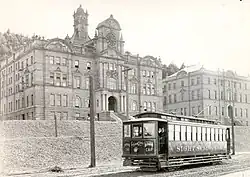 Meanwhile, Congregational minister Henry Durant, an alumnus of Yale, had established the private Contra Costa Academy, on June 20, 1853, in Oakland, California.[22] The initial site was bounded by Twelfth and Fourteenth Streets and Harrison and Franklin Streets in downtown Oakland[22] (and is marked today by State Historical Plaque No. 45 at the northeast corner of Thirteenth and Franklin). In turn, the academy's trustees were granted a charter in 1855 for a College of California, though the college continued to operate as a college preparatory school until it added college-level courses in 1860.[22][23] The college's trustees, educators, and supporters believed in the importance of a liberal arts education (especially the study of the Greek and Roman classics), but ran into a lack of interest in liberal arts colleges on the American frontier (for post-secondary degrees, the college was graduating only three or four students per year).[23]