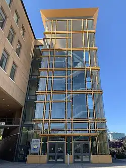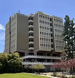Construction on the campus all but ceased after the Administration building, Aldrich Hall, was completed in 1974, and then resumed in the late 1980s, beginning a massive building boom that continues today. This second building boom continued the futuristic trend, but emphasized a much more colorful, postmodern approach that somewhat contradicted the earthy, organic designs of the early buildings. New campus architect David J. Neuman, succeeding Pereira in 1977,[75] brought in architects such as Frank Gehry, Robert Venturi, Eric Owen Moss, James Stirling and Arthur Erickson to bring the campus more up to date. The recession in the early 1990s along with internal politics led to a change in direction, due to the reduced capital budget, and changing attitudes towards architectural innovation at the university. This, in turn, led to a "contextualist" approach beginning in the late 1990s combining stylistic elements of the first two phases in an attempt to provide an architectural "middle ground" between the two vastly different styles. Sticking out like a "sore thumb" amongst the postmodern structures with its sea foam green exterior, Canadian architect Arthur Erickson's Biological Sciences II (later renamed McGaugh Hall in 2001) was designed in 1986 with Francisco Kripacz and completed in 1991.[76] Even with its disparate color palette, reminding some of a "plant cell" and in stark contrast with the campus's early buildings, it was still limited to a height comparable to its surrounding buildings and constrained by the curvature of Aldrich Park.[77][78][79]