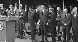 On June 20, 1964, U.S. President Lyndon B. Johnson dedicated UC Irvine before a crowd of 15,000 people, and on October 4, 1965, the campus began operations with 1,589 students, 241 staff members, 119 faculty, and 43 teaching assistants.[25][26] However, many of UCI's buildings were still under construction, and landscaping was still in progress, with the campus only at 75% completion.[27] By June 25, 1966, UCI held its first Commencement with fourteen students, which conferred ten Bachelor of Arts degrees, three Master of Arts degrees, and one Doctor of Philosophy degree.[28]