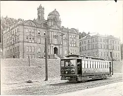 The Affiliated Colleges buildings in 1908, with the streetcar that used to run on Parnassus