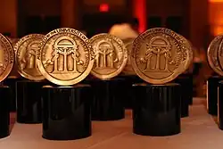 The Peabody Awards (statuettes pictured) originated at, and are awarded by, the University of Georgia
