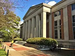 The following year, the quarterly literary journal The Georgia Review began publication in 1947.[45][46] After Jonathan Rogers' brief tenure as president (1949–1950),[27] Omer Clyde Aderhold started his 17-year-long stint as UGA president. During his tenure, the university sold Coordinate Campus to the U.S. Navy. He opened the school's main library, the Ilah Dunlap-Little Memorial Library, in 1952, and in 1964, established the School of Social Work.[45] The university also built a new Science Center on South Campus consisting of six buildings.[48] After UGA's pharmacy school moved to the new facility on the South Campus, the two portions of the campus took on distinct characteristics, with North Campus focused on arts, humanities, and law, and South Campus focused on natural sciences and agricultural programs.[49]
