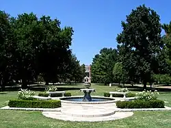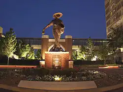 The north campus and airfield were built in the early 1940s as Naval Air Station Norman. The station served mainly an advanced flight training mission and could handle all but the largest bombers.[22] A large earthen mound east of Interstate 35 and north of Robinson Street, colloquially known as "Mount Williams",[23] was a gunnery (the mound has been removed to make way for a commercial development).[24] In the post–World War II demobilization, the university received the installation. Naval aviator's wings displayed at the entrance to the terminal commemorates this airfield's Naval past.