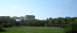The original architectural plan called for the university buildings to be constructed around a green space known as The Bowl. The original university buildings are now connected by skywalks and tunnels. Clockwise, from the north; Thorvaldson Building (August 22, 1924) (Spinks addition); Geology, W.P. Thompson Biology (1960) adjoined to Physics Building (1921); College Building (May 1, 1913) (Administration addition); Saskatchewan conjoined with Athabasca Hall (1964); Qu'Appelle Hall (1916); Marquis Hall adjoined to Place Riel – Qu'Appelle Addition; Murray Memorial Main Library (1956); Arts (1960) conjoined with Law and adjoined to Commerce building complete the initial circle around the perimeter of the bowl.[35][36]