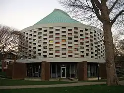 The Meeting House at the University of Sussex is a striking circular chapel designed by Spence and completed in 1966. Built from patterned brick with a dramatic, light-filled interior, it serves as a multi-faith space for worship, reflection, and events. Its distinctive modernist design makes it a landmark on the university’s campus.[37] In 1969 it won the Civic Trust award and was listed in 1993 alongside other buildings on the campus.[35] Inside, adorning the organ loft, is a large, colourful tapestry designed by John Piper commissioned in 1976 to celebrate 10 years since the building was completed. It was inspired by the University’s motto ‘Be still, and know’, which is taken from Psalm 46. Its colours echo the honeycomb of coloured glass panes.[38]
