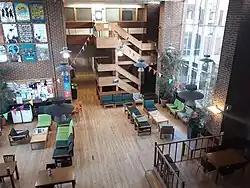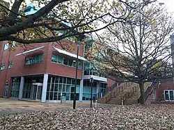The campus is self-contained, with facilities including eights cafes/restaurants, a post office, a Co-op Food store, a market, a bank, a pharmacy, a health centre (including a dentist) and childcare facilities.[34] Spence's designs were appreciated by architects; many of the campus buildings won awards. A number of features define these buildings, including the materials used and the fact that many of them have planted and tree-filled courtyards. The gatehouse-inspired Falmer House won a bronze medal from the Royal Institute of British Architects.[5] In 1993, the buildings which made up the core of Spence's designs were given listed building status, with Falmer House being awarded the highest designation, Grade 1, as a building of "exceptional interest".[35] A number of the original buildings are now Grade II listed buildings.[36]