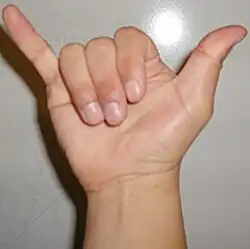 This hand symbol represents the traditional tool used by miners, the pickaxe, and is similar to the shaka sign and the letter Y in American sign language. This gesture is made by UTEP fans when UTEP players are shooting free throws at basketball games, or any time UTEP kicks off at a football game. It originated during a cheer camp by the UTEP cheerleading squad during the early 1980s.[44]