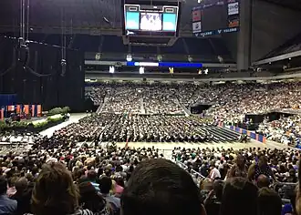 The 671 graduate students composing the first class at the university began attending classes on June 5, 1973.[30][31] Upperclassmen and lowerclassmen were admitted in 1975 and 1976, respectively.[20] Students temporarily attended class at the Koger Center, which also housed administrative offices until 1975, when construction on the Main Campus was completed.[31][26] Enrollment during this time numbered 4,433 students.[32] UTSA began with five colleges: Business, Fine and Applied Arts, Humanities and Social Sciences, Multidisciplinary Studies and Science and Mathematics.[27]