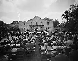 The University of Texas at San Antonio was officially founded on June 5, 1969, by the 61st Texas Legislature as H.B. 42 and signed into law by Governor Preston Smith.[20][21][22] Frank Lombardino, a conservative Democrat who represented northwest Bexar County in the state legislature, was known as the "father of UTSA" due to his impassioned advocacy for the institution.[23] When Governor Smith signed the bill officially establishing the university, he did so on the back of Lombardino in a ceremony in front of the Alamo.[24] At the university's inaugural commencement, the first diploma was also signed on Lombardino's back.[25]