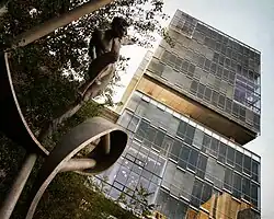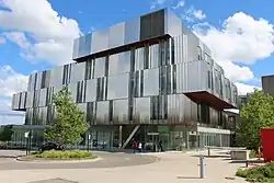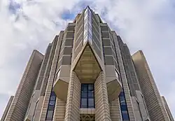 Developed after the Second World War, the western section of the campus consists mainly of modernist and internationalist structures that house laboratories and faculty offices.[60] The most significant example of Brutalist architecture is the massive Robarts Library complex, built in 1972 and opened a year later in 1973. It features raised podia, extensive use of triangular geometric designs and a towering 14-storey concrete structure that cantilevers above a field of open space and mature trees.[73] Sidney Smith Hall is the home to the Faculty of Arts and Science, as well as a few departments within the faculty. The Leslie L. Dan Pharmacy Building, completed in 2006, exhibits the high-tech architectural style of glass and steel by British architect Norman Foster.[74]