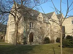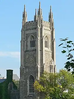 A lawn at the northeast is anchored by Hart House, a Gothic-revival student centre complex. Among its many common rooms, the building's Great Hall is noted for large stained-glass windows and a long quotation from John Milton's Areopagitica inscribed around the walls.[66][67] The adjacent Soldiers' Tower stands 143 feet (44 m) tall as the most prominent structure in the vicinity, its stone arches etched with the names of university members lost to the battlefields of the two World Wars.[68] The tower houses a 51-bell carillon played on special occasions such as Remembrance Day and convocation.[69] North of University College, the main building of Trinity College displays Jacobethan Tudor architecture, while its chapel was built in the Perpendicular Gothic style of Giles Gilbert Scott.[70] The chapel features exterior walls of sandstone and interiors of Indiana Limestone and was built by Italian stonemasons using ancient building methods.[71] Philosopher's Walk is a scenic footpath that follows a meandering, wooded ravine, the buried Taddle Creek, linking with Trinity College, Varsity Arena and the Henry N.R. Jackman Faculty of Law. Victoria College is on the eastern side of Queen's Park, centred on a Romanesque main building made of contrasting red sandstone and grey limestone.[72]