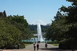 Organizers of the 1909 Alaska–Yukon–Pacific Exposition eyed the still largely undeveloped campus as a prime setting for their world's fair. They came to an agreement with Washington's Board of Regents that allowed them to use the campus grounds for the exposition, surrounding today's Drumheller Fountain facing towards Mount Rainier. In exchange, organizers agreed Washington would take over the campus and its development after the fair's conclusion. This arrangement led to a detailed site plan and several new buildings, prepared in part by John Charles Olmsted. The plan was later incorporated into the overall UW campus master plan, permanently affecting the campus layout.