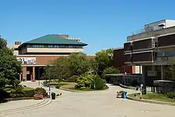 Sandburg Halls is the largest student residence hall on campus. It is a four-tower complex with a capacity of 2,700 students, arranged in three- and four-room suites. The North, South, and West towers were built in 1970, with the East tower opening in 2000. All East tower suites have full-size kitchens and a dining area. Sandburg Hall went through a renovation in the summer of 2008 with the installation of an environmentally friendly roof. Following a design by associate professor Jim Walsey, this change was intended to prevent overflows and backups into neighboring homes.[48] Facilities inside the building include a cafeteria, fitness center, convenience store, coffee shop, computer lab and a second-run movie theater for residents.[49] Sandburg Halls also has space for recreational activities, including grass space, a patio, basketball courts, and sand volleyball.