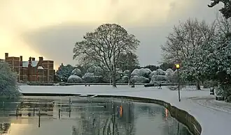 The campus lake is the largest plastic-bottomed lake in Europe.[23] The decision by Sir Andrew Derbyshire and Stirrat Johnson-Marshall to give the university a lake had two motivations: one, to give the university a distinct image and identity while also creating areas to foster community; and two, more practically to create a drainage basin for the relatively flat agricultural site as it was feared the construction of the new buildings would increase the risk of flooding.[39] The lake has attracted a large population of wild and semi-wild waterfowl, including greylag, Canada, barnacle and snow geese, coots, moorhens and large numbers of ducks, including mallards, tufted ducks, and common pochards. There is also a growing population of black swans and a few great crested grebe. Grey herons have also been sighted on the lake. The southern end of the lake has been established as a bird sanctuary. Fishing is permitted in season, on purchase of a licence. On occasions the lake has been called Scullion's Lake.[45] However, the use of this name varies, which challenges it's authenticity. It has been applied to the whole lake,[46] to the Derwent fish pond,[47] and to the end of the lake around Wentworth.[48] No historic use of the term has been found to add support to any of these terms use.