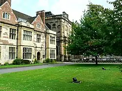 John Bowes Morrell was the driving force behind the university's establishment.[14] York accepted its first students the year of Morrell's death, 1963, opening with 216 undergraduates, 14 postgraduates, and 28 academic and administrative staff.[18] The university started with six departments: Economics, Education, English, History, Mathematics, Politics.[15] At the time, the university consisted of three buildings, principally the historic King's Manor in the city centre and Heslington Hall, which has Tudor foundations and is in the village of Heslington on the edge of York. A year later, work began on purpose-built structures on the Heslington Campus, which now forms the main part of the university.