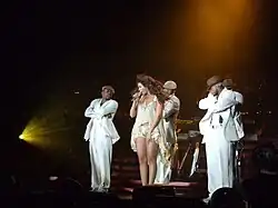 Although Beyoncé did not perform the song in any televised appearances, it was a part of her set list on The Beyoncé Experience with Jay-Z in Los Angeles on September 2, 2007, and her worldwide I Am... World Tour.[38] When Beyoncé performed the song in Sunrise, Florida, on June 29, 2009, she was wearing a glittering gold leotard. As she sang, animated graphics of turntables, faders, and other nightclub equipment pulsed behind her, her dancers and the musicians.[39] Beyoncé was accompanied by two drummers, two keyboardists, a percussionist, a horn section, three backup vocalists (collectively called Suga Mama), and guitarist Bibi McGill.[40] "Upgrade U" was included as the fourteenth and twenty-second tracks on her live albums The Beyoncé Experience Live (2007)[41] and I Am... World Tour (2010), respectively.[42] "Upgrade U" was part of the set list of Beyoncé and Jay-Z's co-headlining On the Run Tour (2014).[43]