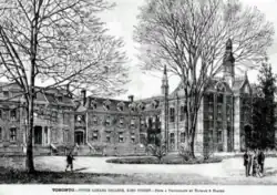 The school began teaching in the original Royal Grammar School. However, within a year, it was established on its own campus, known as Russell Square,[12] at the north-west corner of King and Simcoe streets. Colborne brought educated men from the United Kingdom's Cambridge and Oxford Universities, attracting them with high salaries.[19] Still, despite ever increasing enrolment, popularity with leading families of the day (both from the local Family Compact and from abroad);[20] a visit in 1847 from the Governor General of the Province of Canada, the Earl of Elgin;[21] and praise from many, including Charles Dickens,[22][23] UCC was faced with closure on a number of occasions. Opponents of elitism[24][25] sought to curtail provincial government funding[26] and remove the college from its premises.[25]