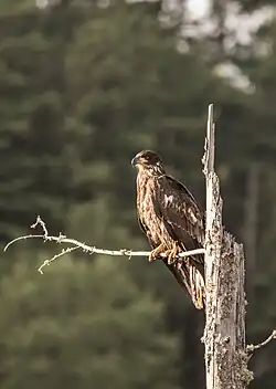 The Upper Peninsula contains a large variety of wildlife. Some of the mammals found in the UP include shrews, moles, mice, white-tailed deer, moose, black bears, cougar, gray and red foxes, wolves, river otters, martens, fishers, muskrats, bobcats, coyotes, snowshoe hares, cotton-tail rabbits, porcupines, chipmunks, squirrels, raccoons, opossum and bats. There is a large variety of birds, including hawks, osprey, owls, gulls, hummingbirds, chickadees, robins (the state bird), woodpeckers, warblers, and bald eagles. In terms of reptiles and amphibians, the UP has common garter snakes, red bellied snakes, pine snakes, northern water snakes, brown snakes, eastern garter snakes, eastern fox snakes, eastern ribbon back snakes, green snakes, northern ringneck snakes, eastern milk snakes (Mackinac and Marquette counties) and eastern hognose snakes (Menominee County only), plus snapping turtles, wood turtles, and painted turtles (the state reptile), green frogs, bullfrogs, northern leopard frogs, and salamanders. Lakes and rivers contain many fish such as walleye, muskie, northern pike, trout, salmon, bullhead catfish, and bass. Invasive species like the alewife and sea lamprey can be found in the Great Lakes. The UP also contains many shellfish, such as clams, aquatic snails, and crayfish. The American Bird Conservancy and the National Audubon Society have designated several locations as internationally Important Bird Areas.[18]