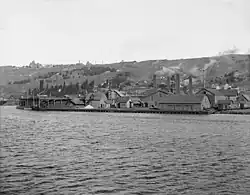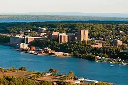 At the time, Michigan was considered the losing party in the compromise. The land in the Upper Peninsula was described in a federal report as a "sterile region on the shores of Lake Superior destined by soil and climate to remain forever a wilderness."[6] This belief changed when rich mineral deposits (primarily copper and iron) were discovered in the 1840s. The Upper Peninsula's mines produced more mineral wealth than the California Gold Rush, especially after shipping was improved by the opening of the Soo Locks in 1855 and docks in Marquette in 1859. The Upper Peninsula supplied 90% of America's copper by the 1860s. It was the nation's largest supplier of iron ore by the 1890s, and production continued to a peak in the 1920s but sharply declined shortly afterward. The last copper mine closed in 1995, although the majority of mines had closed decades before. Some iron mining continues near Marquette.[6] The Eagle Mine, a nickel-copper mine, opened in 2014.[8]