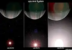 27. ^ a b c Pizkorz, D.; et al. (August 2017). "Detection of Water Vapor in the Thermal Spectrum of the Non-transiting Hot Jupiter Upsilon Andromedae b". The Astronomical Journal. 154 (2): 78. arXiv:1707.01534. Bibcode:2017AJ....154...78P. doi:10.3847/1538-3881/aa7dd8. S2CID 19960378.