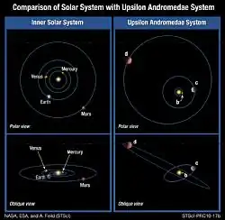 The orbital parameters of this three-planet system have been fully determined. The system is not coplanar, with each other or with the stellar rotation, as in the Solar System.[7] Samh, planet c, has an orbit significantly inclined from those of the other two, and from the perspective of Earth is inclined by only about 8 degrees from the celestial sphere; when it was first discovered, it was thought to have a mass closer to only 2 Jupiter masses due to a comparatively small radial velocity signal. Simulations shows that the measured configuration of the planets produces indeed stable orbits for at least 100 million years, where planets b and d remain roughly coplanar. General relativity is expected to have strong effects on planet b, because it orbits at a distance of just ~0.05 AU from the parent star. The apsides of planet c and d, instead, oscillates with time;[27] the orbit of Upsilon Andromedae c thus returns to a nearly circular state every 9,000 years. The eccentricity of those planets may have arisen from a close encounter between the outer planet and a fourth planet, with the result that the third planet was ejected from the system or destroyed.[34] Such a mechanism could have been triggered by perturbations on the orbit of the companion star, which arise from close encounters with other stars and from the tidal field of the Milky Way.[35] The orbits of the two inner planets seems to be shaped by tidal interactions, while the evolution of c and d orbits is secular.[36]